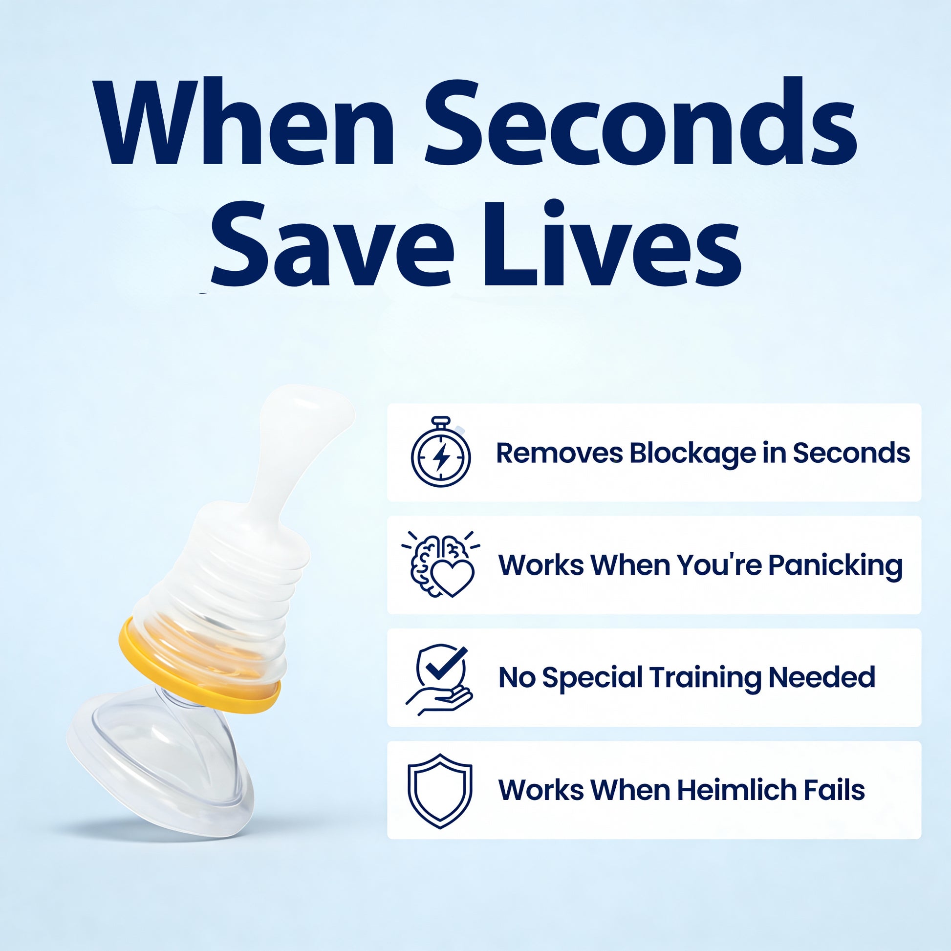 It's a simple 3-step process: Place the mask over the nose and mouth, Push the handle down, then Pull rapidly to create suction that dislodges the obstruction. The one-way valve ensures you can never push air back in or force the object deeper.